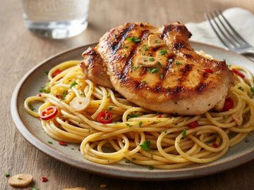 Calling all spice enthusiasts! Our delicious aglio e olio pasta will tantalize your taste buds, beautifully topped with succulent, perfectly grilled boneless chicken leg.