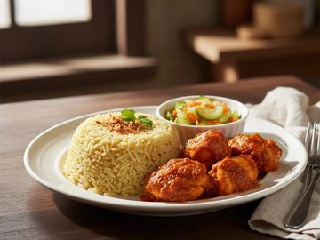 Indulge in the unforgettable flavors of a Malay wedding feast. Experience the rich Nasi Minyak paired beautifully with savory Ayam Masak Merah and refreshing Acar Timun.
