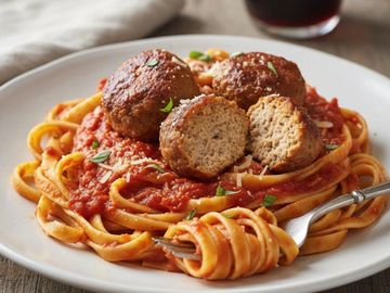 Indulge in our perfectly cooked fettuccine, artfully topped with a delightful blend of ripe tomatoes, fragrant herbs, and spices. It's all complemented by tender chicken meatballs for a truly satisfying meal.