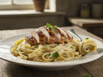 Savor the delectable fettuccini cooked to perfection, featuring a rich Alfredo sauce that delights the palate, all accompanied by succulent grilled boneless chicken leg.