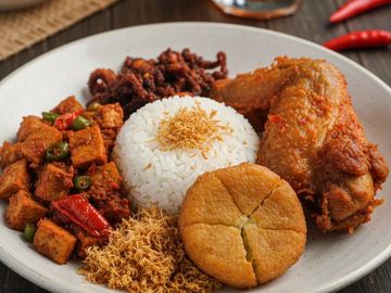 Experience the deliciousness of nasi sambal goreng ayam, accompanied by flavorful sambal goreng, succulent sambal sotong, bagedil, aromatic serondeng, and a perfectly cooked piece of chicken. Treat your taste buds to this mouthwatering feast!.